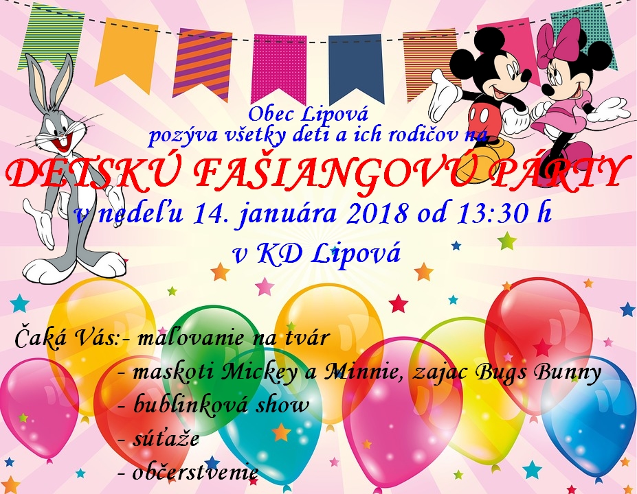 Pozvánka na detskú fašiangovú párty Podrobnosti Kategória: Aktuality Dátum uverejnenia: pondelok, 08. január 2018, 16:01 Napísal: ouclanky Prečítané: 2652x < Predch. Nasl. > Tweet Comments