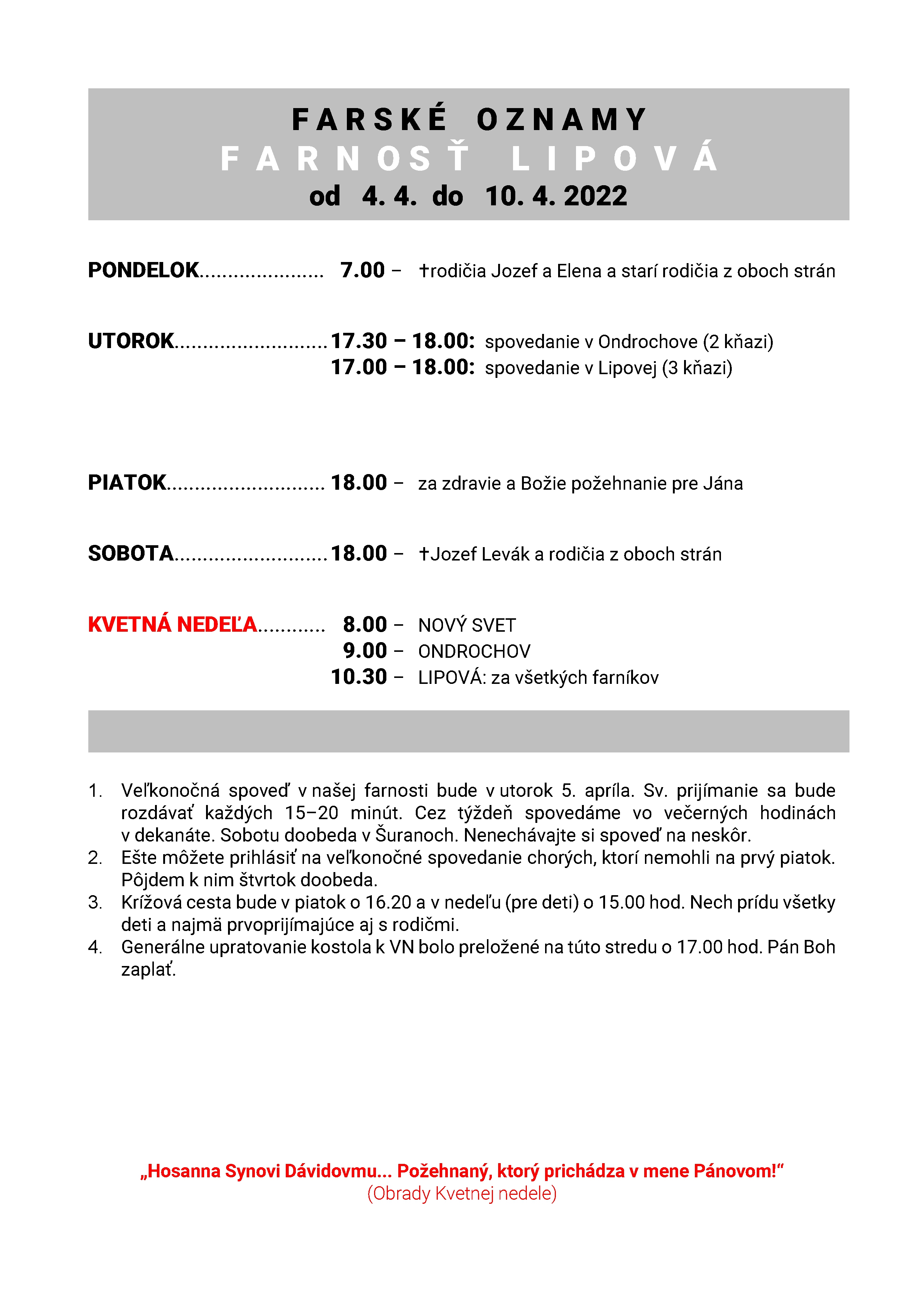 Poriadok bohoslužieb od 04.04. do 10.04.2022 Podrobnosti Dátum uverejnenia: pondelok, 04. apríl 2022, 08:10 Napísal: ouclanky Prečítané: 481x