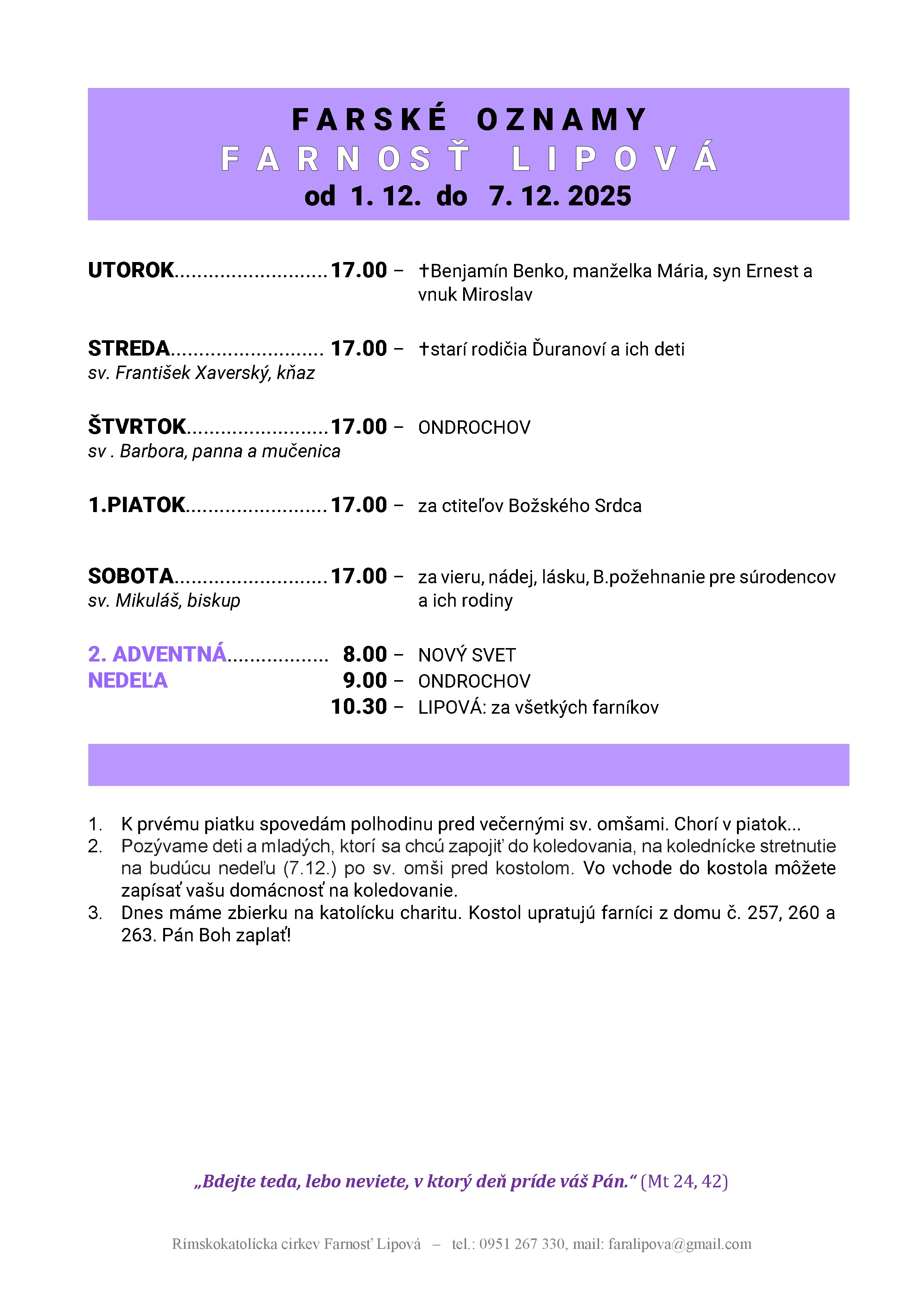 Poriadok bohoslužieb od 01.12. do 07.12.2025 Podrobnosti Dátum uverejnenia: utorok, 02. december 2025, 00:02 Napísal: ouclanky Prečítané: 3x