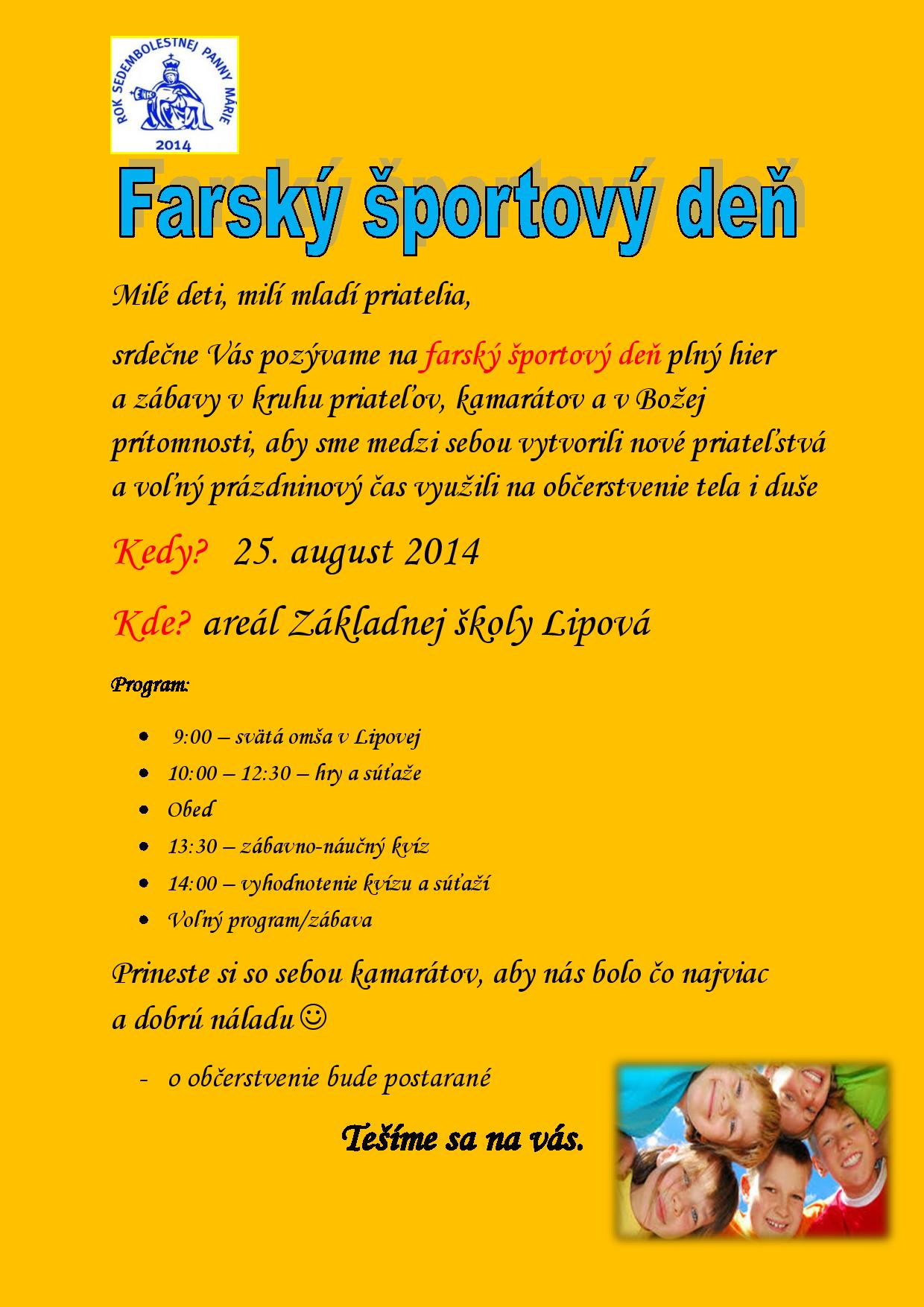Farský športový deň Podrobnosti Dátum uverejnenia: štvrtok, 21. august 2014, 09:14 Napísal: ouclanky Prečítané: 1144x