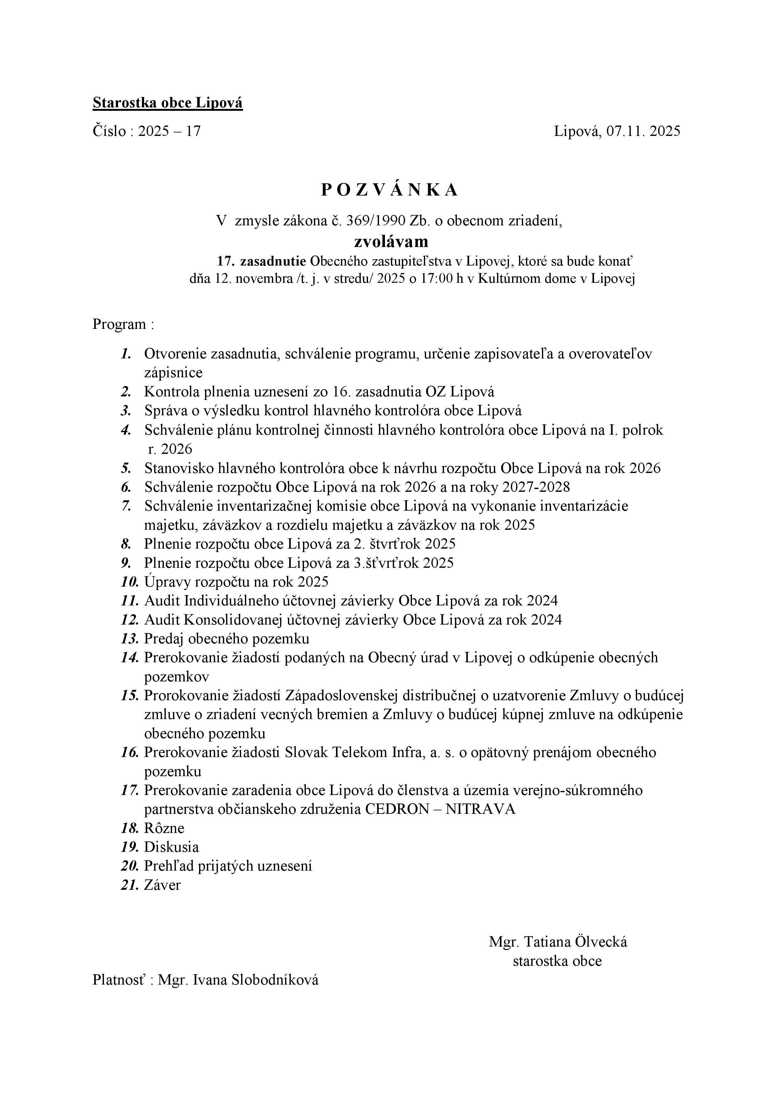 Pozvánka na 17. zasadnutie OZ Lipová 12.11.2025 Podrobnosti Dátum uverejnenia: piatok, 07. november 2025, 12:58 Napísal: ouclanky Prečítané: 8x Nasl. > Tweet Comments
