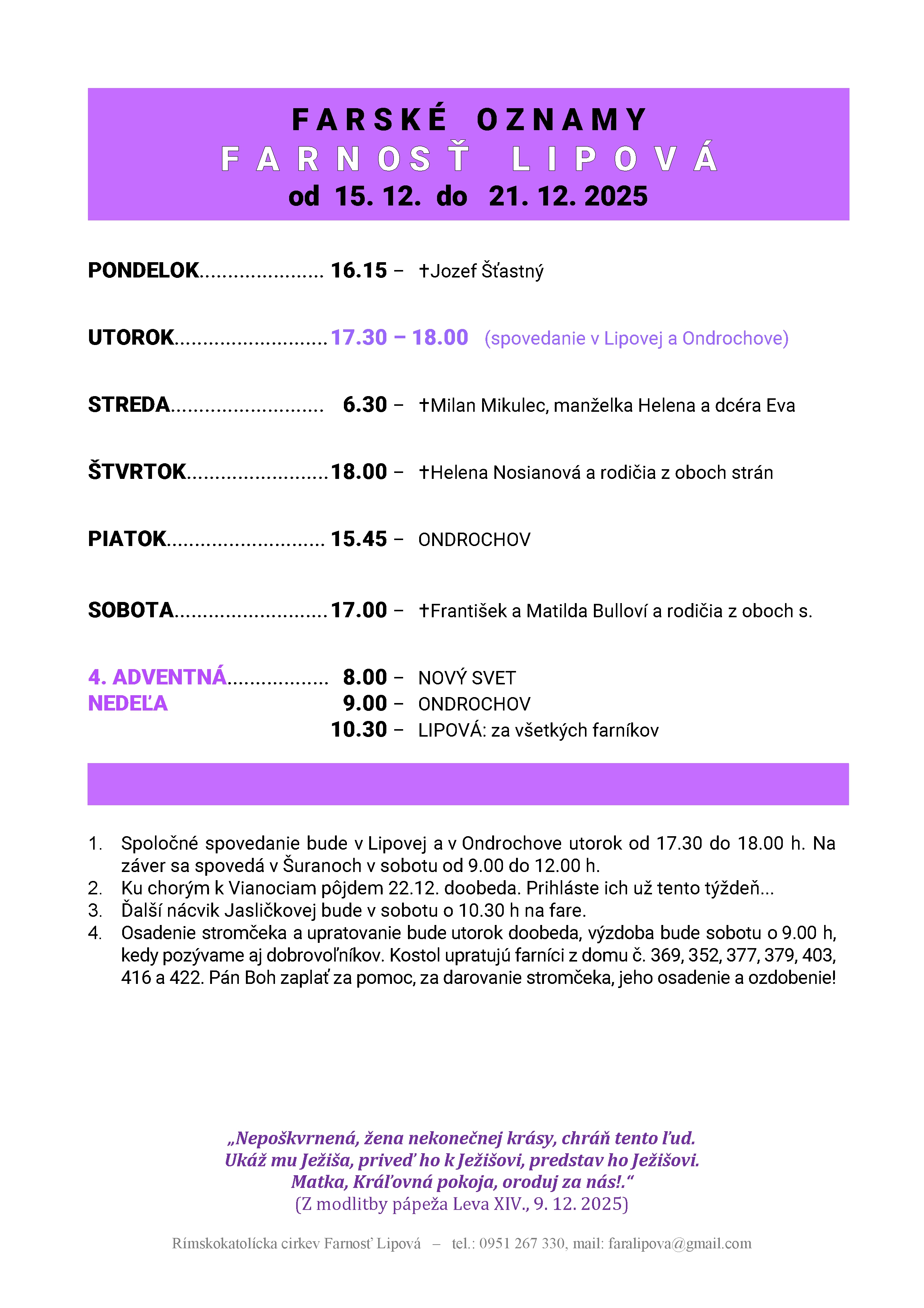 Poriadok bohoslužieb od 15.12. do 21.12.2025 Podrobnosti Dátum uverejnenia: štvrtok, 18. december 2025, 15:13 Napísal: ouclanky Prečítané: 20x